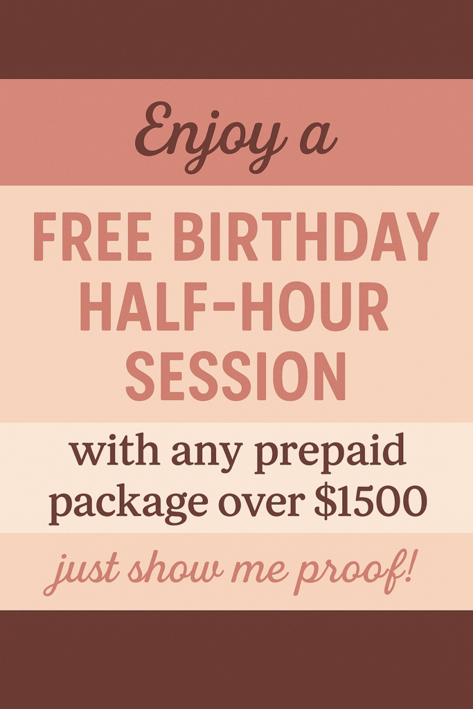 As the nights grow longer and the days get chillier, I want to warm things up with some irresistible prepaid deals! ⨠Available to purchase now through the end of 2025⨠Valid at time of purchase through all of 2026⨠Buy as many as you can handle! āļø No same-day fee on ANY prepaid sessions.āļø…